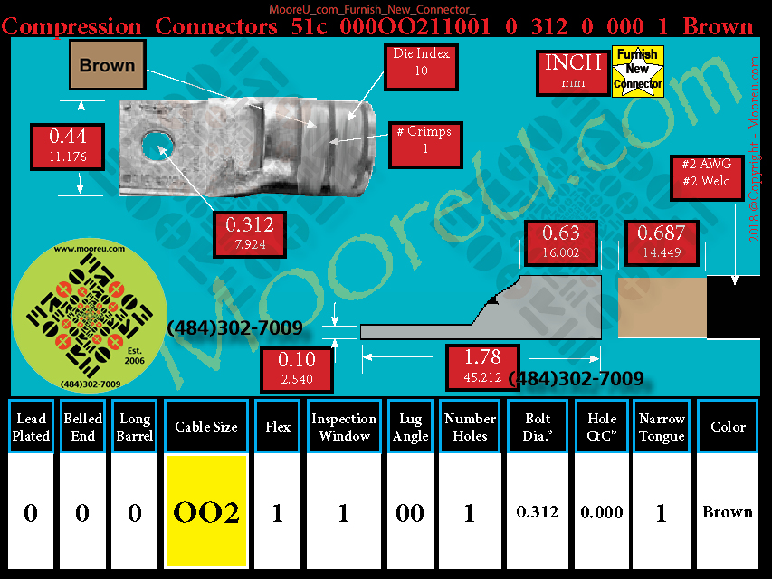 Each, Color: Brown, Lead Plate: No, Belled: No, Barrel: Std., Conductor: #2 AWG, #2 Weld 125/24, 150/24, Flex: Yes, Inspect Window: Yes, Angle: OO, Num Holes: 1, Bolt Size Dia: 5/16", C To C: 0, Tongue: Narrow, Tongue Wide: 0.44, Barrel L: 0.63, Thick: 0.10, Length: 1.78, mm x mm= 35