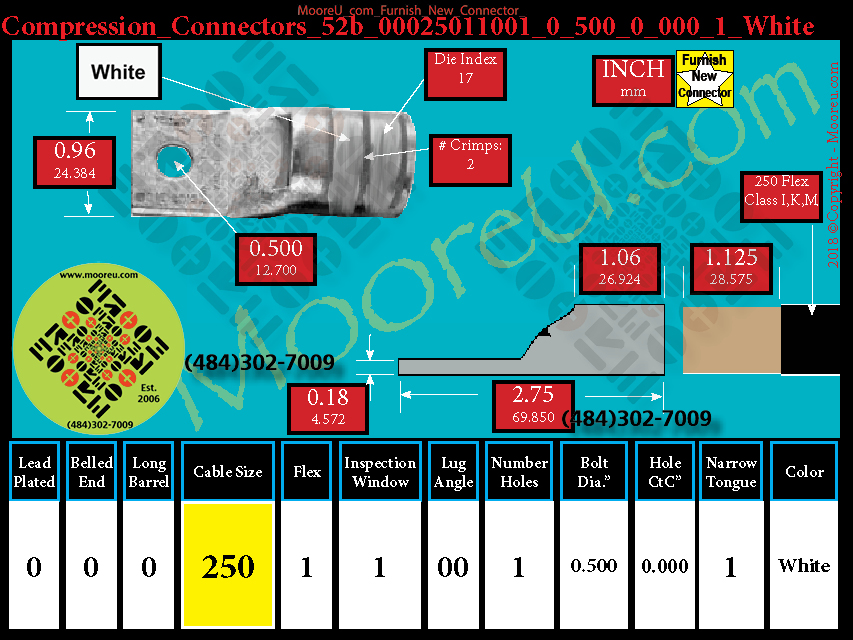 Each, Color: White, Lead Plate: No, Belled: No, Barrel: Std., Conductor: 250 Flex 637/24 CLASS I, K, M, Flex: Yes, Inspect Window: Yes, Angle: OO, Num Holes: 1, Bolt Size Dia: 1/2", C To C: 0, Tongue: Narrow, Tongue Wide: 0.96, Barrel L: 1.06, Thick: 0.18, Length: 2.75, mm x mm= 150