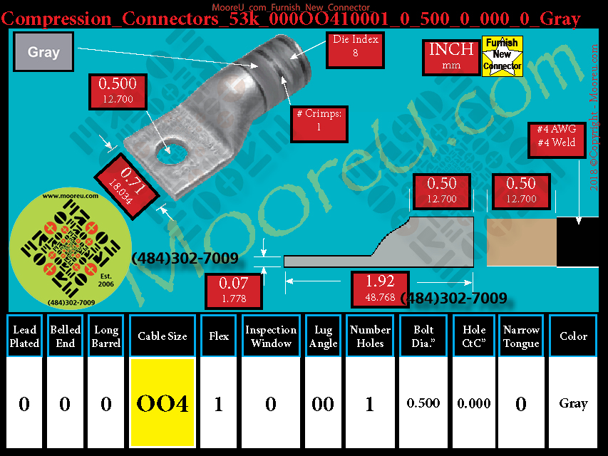 Each, Color: Gray, Lead Plate: No, Belled: No, Barrel: Std., Conductor: 91/24, 105/24, #4 AWG, #4 Weld, Flex: Yes, Inspect Window: No, Angle: OO, Num Holes: 1, Bolt Size Dia: 3/8", C To C: 0, Tongue: Std, Tongue Wide: 0.58, Barrel L: 0.50, Thick: 0.08, Length: 1.67, mm x mm= n/a