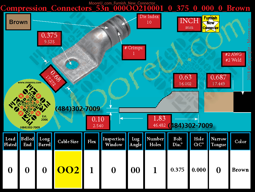 Each, Color: Brown, Lead Plate: No, Belled: No, Barrel: Std., Conductor: #2 AWG, #2 Weld 125/24, 150/24, Flex: Yes, Inspect Window: No, Angle: OO, Num Holes: 1, Bolt Size Dia: 3/8", C To C: 0, Tongue: Std, Tongue Wide: 0.68, Barrel L: 0.63, Thick: 0.10, Length: 1.83, mm x mm= 35