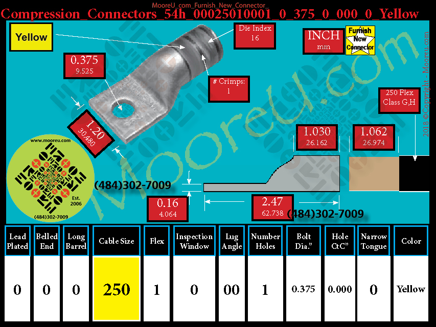 Each, Color: Yellow, Lead Plate: No, Belled: No, Barrel: Std., Conductor: 250 Flex Class G 259 Str., Class H 427 Str., Flex: Yes, Inspect Window: No, Angle: OO, Num Holes: 1, Bolt Size Dia: 3/8", C To C: 0, Tongue: Std, Tongue Wide: 1.20, Barrel L: 1.03, Thick: 0.16, Length: 2.47, mm x mm= n/a