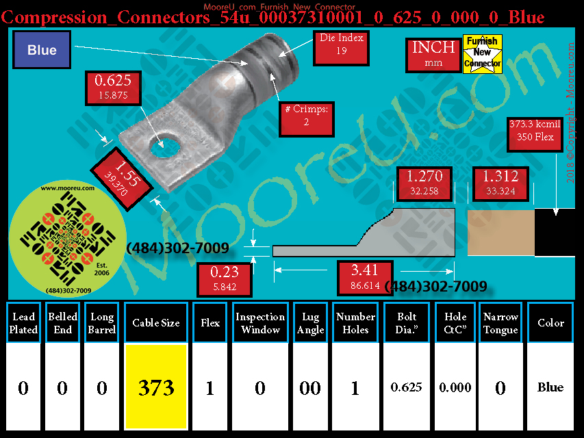 Each, Color: Blue, Lead Plate: No, Belled: No, Barrel: Std., Conductor: 373.3 kcmil 925/24 350 Flex, Flex: Yes, Inspect Window: No, Angle: OO, Num Holes: 1, Bolt Size Dia: 5/8", C To C: 0, Tongue: Std, Tongue Wide: 1.55, Barrel L: 1.27, Thick: 0.23, Length: 3.41, mm x mm= 240