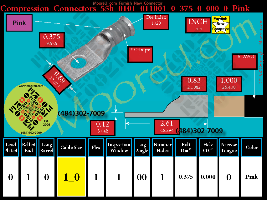 Each, Color: Pink, Lead Plate: No, Belled: Yes, Barrel: Std., Conductor: 1/0, Flex: Yes, Inspect Window: Yes, Angle: OO, Num Holes: 1, Bolt Size Dia: 3/8", C To C: 0, Tongue: Std, Tongue Wide: , Barrel L: 0.83, Thick: , Length: 2.61, mm x mm= n/a