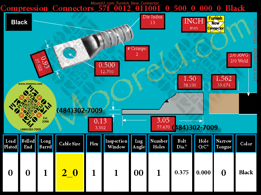 Each, Color: Black, Lead Plate: No, Belled: No, Barrel: Long, Conductor: 325/24, 2/0 Weld 2/0 AWG, Flex: Yes, Inspect Window: Yes, Angle: OO, Num Holes: 1, Bolt Size Dia: 1/2", C To C: 0, Tongue: Std, Tongue Wide: 0.93, Barrel L: 1.50, Thick: 0.13, Length: 3.05, mm x mm= 70
