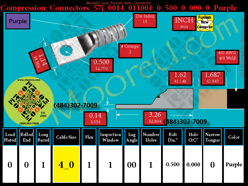 Each, Color: Purple, Lead Plate: No, Belled: No, Barrel: Long, Conductor: 550/24, 4/0 Weld 4/0 AWG, Flex: Yes, Inspect Window: Yes, Angle: OO, Num Holes: 1, Bolt Size Dia: 1/2", C To C: 0, Tongue: Std, Tongue Wide: 1.14, Barrel L: 1.62, Thick: 0.14, Length: 3.26, mm x mm= 120
