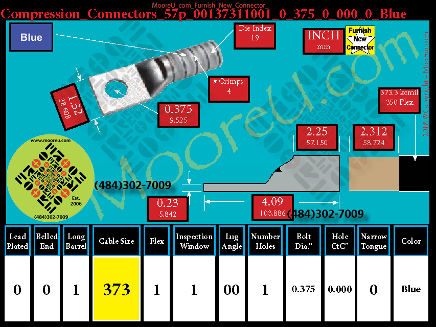 Each, Color: Blue, Lead Plate: No, Belled: No, Barrel: Long, Conductor: 925/24, 373.3 kcmil 350 Flex, Flex: Yes, Inspect Window: Yes, Angle: OO, Num Holes: 1, Bolt Size Dia: 3/8", C To C: 0, Tongue: Std, Tongue Wide: 1.52, Barrel L: 2.25, Thick: 0.23, Length: 4.09, mm x mm= 240
