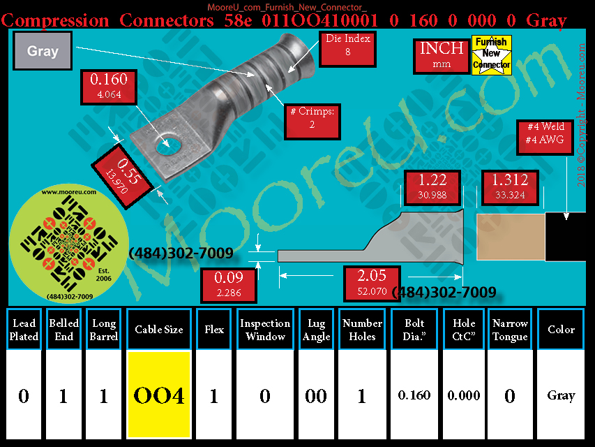 Each, Color: Gray, Lead Plate: No, Belled: Yes, Barrel: Long, Conductor: 91/24, 105/24, #4 Weld, #4 AWG, Flex: Yes, Inspect Window: No, Angle: OO, Num Holes: 1, Bolt Size Dia: #8 - #10, C To C: 0, Tongue: Std, Tongue Wide: 0.55, Barrel L: 1.22, Thick: 0.09, Length: 2.05, mm x mm= n/a