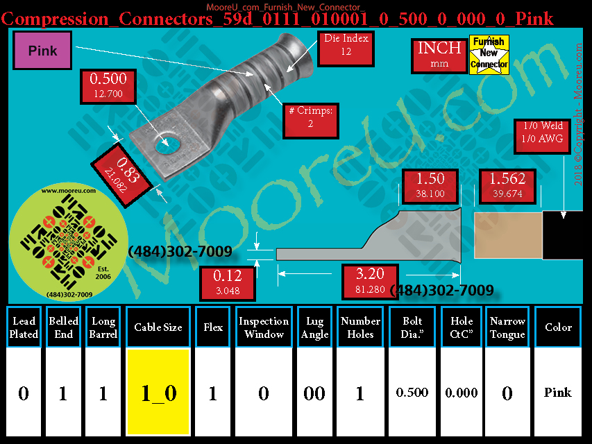 Each, Color: Pink, Lead Plate: No, Belled: Yes, Barrel: Long, Conductor: 275/24, 1/0 Weld 1/0 AWG, Flex: Yes, Inspect Window: No, Angle: OO, Num Holes: 1, Bolt Size Dia: 1/2", C To C: 0, Tongue: Std, Tongue Wide: 0.83, Barrel L: 1.50, Thick: 0.12, Length: 3.20, mm x mm= 50
