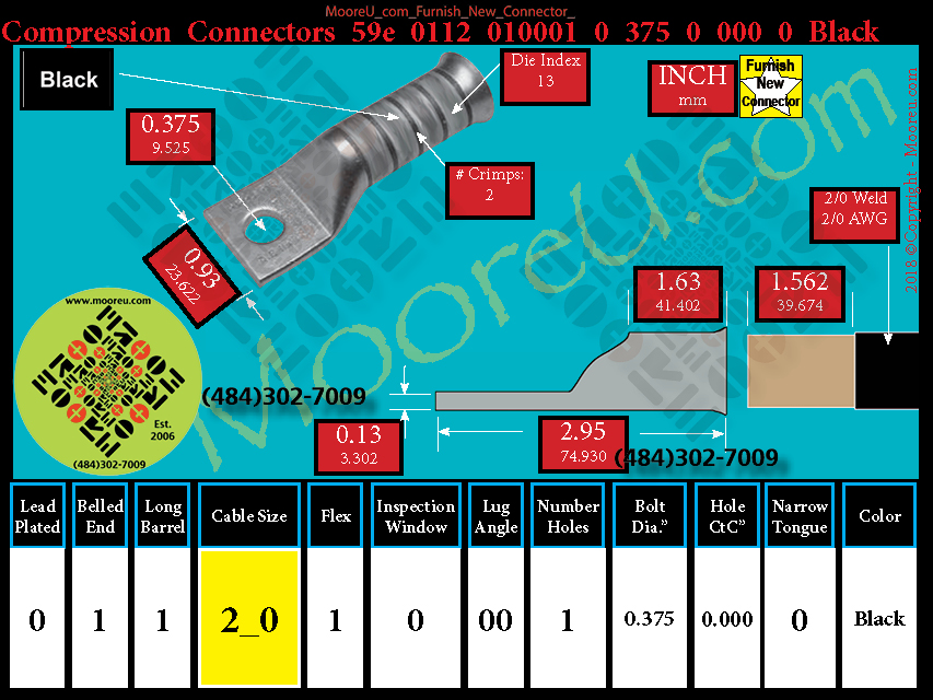Each, Color: Black, Lead Plate: No, Belled: Yes, Barrel: Long, Conductor: 352/24, 2/0 Weld 2/0 AWG, Flex: Yes, Inspect Window: No, Angle: OO, Num Holes: 1, Bolt Size Dia: 3/8", C To C: 0, Tongue: Std, Tongue Wide: 0.93, Barrel L: 1.63, Thick: 0.13, Length: 2.95, mm x mm= 70