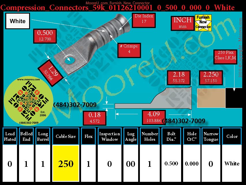 Each, Color: White, Lead Plate: No, Belled: Yes, Barrel: Long, Conductor: 637/24 Class I,K,M, Flex: Yes, Inspect Window: No, Angle: OO, Num Holes: 1, Bolt Size Dia: 1/2", C To C: 0, Tongue: Std, Tongue Wide: 1.29, Barrel L: 2.18, Thick: 0.18, Length: 4.09, mm x mm= 150