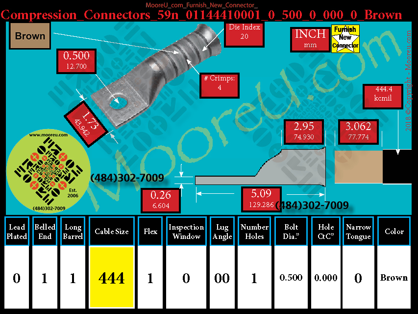 Each, Color: Brown, Lead Plate: No, Belled: Yes, Barrel: Long, Conductor: 444.4 kcmil 1100/24, Flex: Yes, Inspect Window: No, Angle: OO, Num Holes: 1, Bolt Size Dia: 1/2", C To C: 0, Tongue: Std, Tongue Wide: 1.73, Barrel L: 2.95, Thick: 0.26, Length: 5.09, mm x mm= n/a