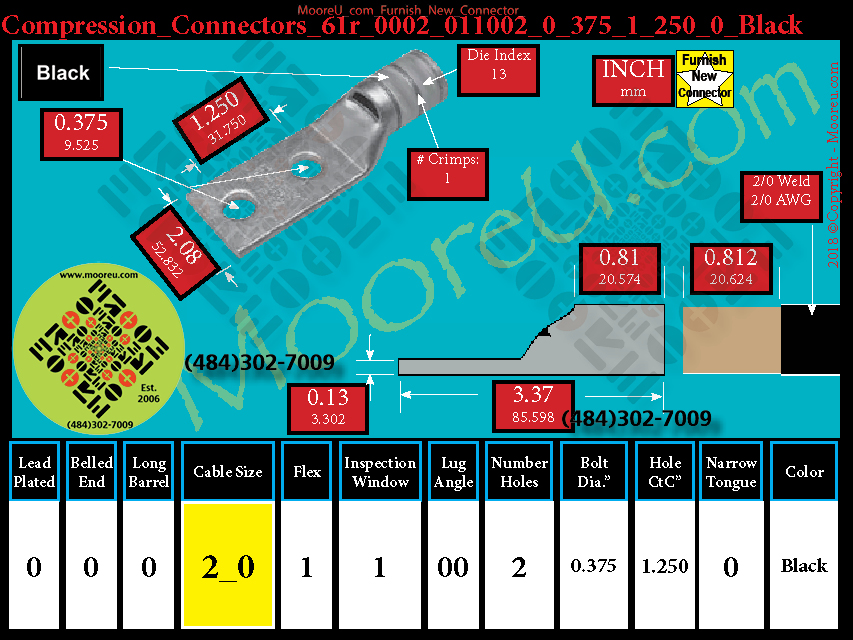 Each, Color: Black, Lead Plate: No, Belled: No, Barrel: Std., Conductor: 325/24 2/0 Weld 2/0 AWG, Flex: Yes, Inspect Window: Yes, Angle: OO, Num Holes: 2, Bolt Size Dia: 3/8", C To C: 1-1/4", Tongue: Std, Tongue Wide: 2.08, Barrel L: 0.81, Thick: 0.13, Length: 3.37, mm x mm= 70