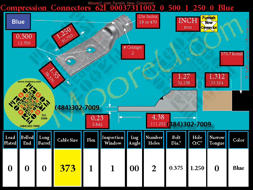 Each, Color: Blue, Lead Plate: No, Belled: No, Barrel: Std., Conductor: 373.7 kcmil 925/24 (350 kcmil Nom.), Flex: Yes, Inspect Window: Yes, Angle: OO, Num Holes: 2, Bolt Size Dia: 1/2", C To C: 1-1/4", Tongue: Std, Tongue Wide: 1.55, Barrel L: 1.27, Thick: 0.23, Length: 4.38, mm x mm= 240