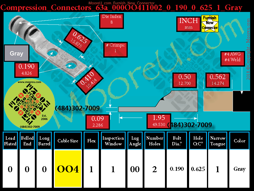 Each, Color: Gray, Lead Plate: No, Belled: No, Barrel: Std., Conductor: #4 AWG #4 Weld 91/24 105/24, Flex: Yes, Inspect Window: Yes, Angle: OO, Num Holes: 2, Bolt Size Dia: #10, C To C: 5/8", Tongue: Narrow, Tongue Wide: 0.41, Barrel L: 0.50, Thick: 0.09, Length: 1.95, mm x mm= n/a