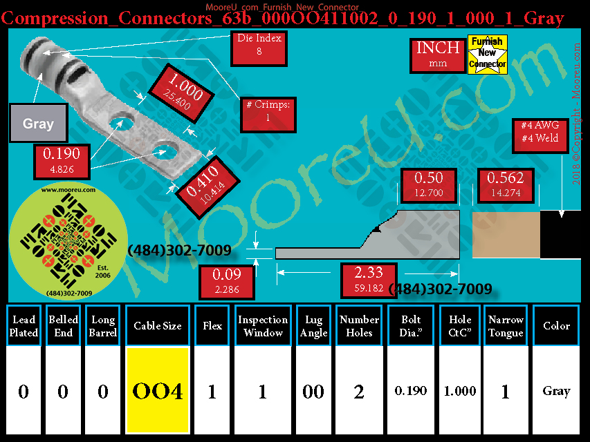 Each, Color: Gray, Lead Plate: No, Belled: No, Barrel: Std., Conductor: #4 AWG #4 Weld 91/24 105/24, Flex: Yes, Inspect Window: Yes, Angle: OO, Num Holes: 2, Bolt Size Dia: #10, C To C: 1", Tongue: Narrow, Tongue Wide: 0.41, Barrel L: 0.50, Thick: 0.09, Length: 2.33, mm x mm= n/a