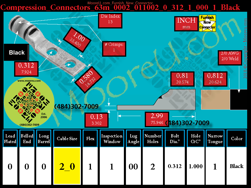 Each, Color: Black, Lead Plate: No, Belled: No, Barrel: Std., Conductor: 2/0 AWG 2/0 Weld 325/24, Flex: Yes, Inspect Window: Yes, Angle: OO, Num Holes: 2, Bolt Size Dia: 5/16", C To C: 1", Tongue: Narrow, Tongue Wide: 0.58, Barrel L: 0.81, Thick: 0.13, Length: 2.99, mm x mm= 70