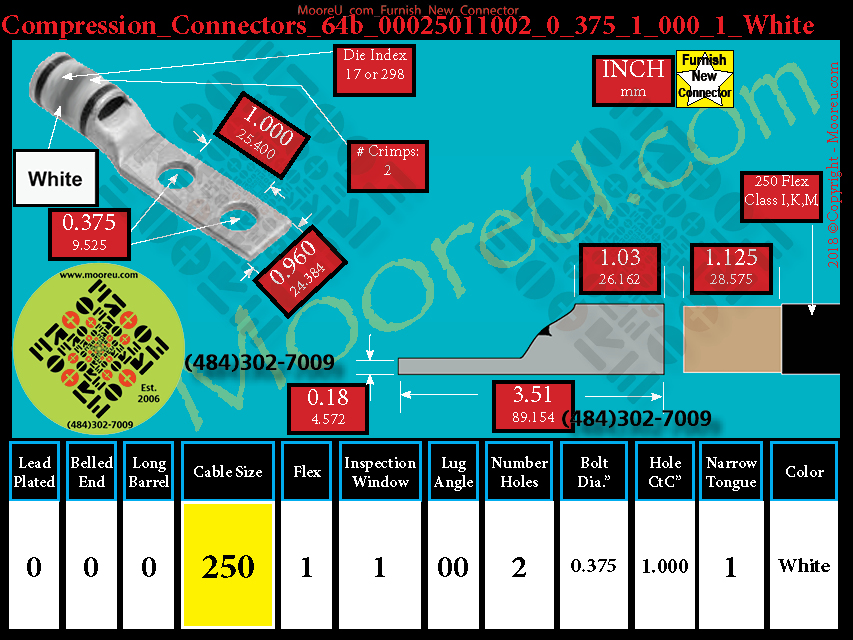 Each, Color: White, Lead Plate: No, Belled: No, Barrel: Std., Conductor: 250 Flex 637/24 Class I,K,M, Flex: Yes, Inspect Window: Yes, Angle: OO, Num Holes: 2, Bolt Size Dia: 3/8", C To C: 1", Tongue: Narrow, Tongue Wide: 0.96, Barrel L: 1.06, Thick: 0.18, Length: 3.51, mm x mm= 150
