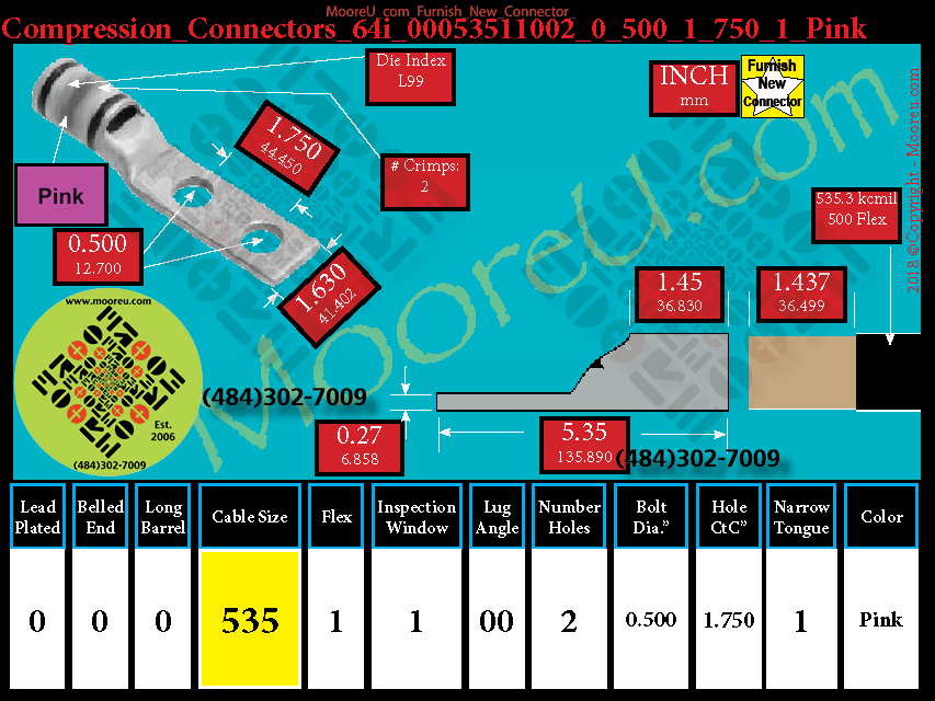 Each, Color: Pink, Lead Plate: No, Belled: No, Barrel: Std., Conductor: 535.3 kcmil 1325/24 500 Flex, Flex: Yes, Inspect Window: Yes, Angle: OO, Num Holes: 2, Bolt Size Dia: 1/2", C To C: 1-3/4", Tongue: Narrow, Tongue Wide: 1.63, Barrel L: 1.45, Thick: 0.27, Length: 5.35, mm x mm= 300