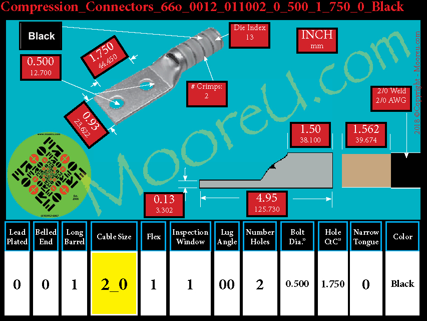 Each, Color: Black, Lead Plate: No, Belled: No, Barrel: Long, Conductor: 325/24 2/0 Weld 2/0 AWG, Flex: Yes, Inspect Window: Yes, Angle: OO, Num Holes: 2, Bolt Size Dia: 1/2", C To C: 1-3/4", Tongue: Std, Tongue Wide: 0.93, Barrel L: 1.50, Thick: 0.13, Length: 4.95, mm x mm= 70