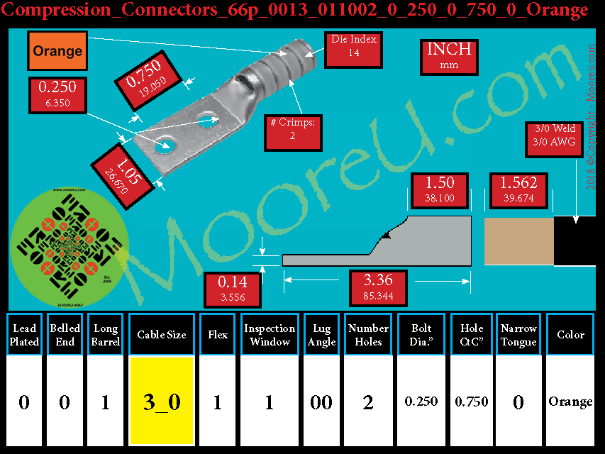 Each, Color: Orange, Lead Plate: No, Belled: No, Barrel: Long, Conductor: 450/24 3/0 Weld 3/0 AWG, Flex: Yes, Inspect Window: Yes, Angle: OO, Num Holes: 2, Bolt Size Dia: 1/4", C To C: 3/4", Tongue: Std, Tongue Wide: 1.03, Barrel L: 1.50, Thick: 0.14, Length: 3.36, mm x mm= 95