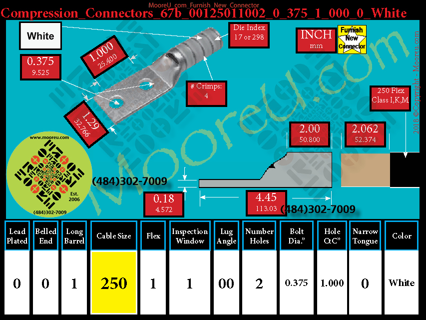 Each, Color: White, Lead Plate: No, Belled: No, Barrel: Long, Conductor: 250 Flex 637/24 CLASS I, K, M, Flex: Yes, Inspect Window: Yes, Angle: OO, Num Holes: 2, Bolt Size Dia: 3/8", C To C: 1", Tongue: Std, Tongue Wide: 1.29, Barrel L: 2.00, Thick: 0.18, Length: 4.45, mm x mm= 150