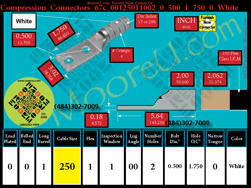 Each, Color: White, Lead Plate: No, Belled: No, Barrel: Long, Conductor: 250 Flex 637/24 CLASS I, K, M, Flex: Yes, Inspect Window: Yes, Angle: OO, Num Holes: 2, Bolt Size Dia: 1/2", C To C: 1-3/4", Tongue: Std, Tongue Wide: 3.02, Barrel L: 2.00, Thick: 0.18, Length: 5.64, mm x mm= 150