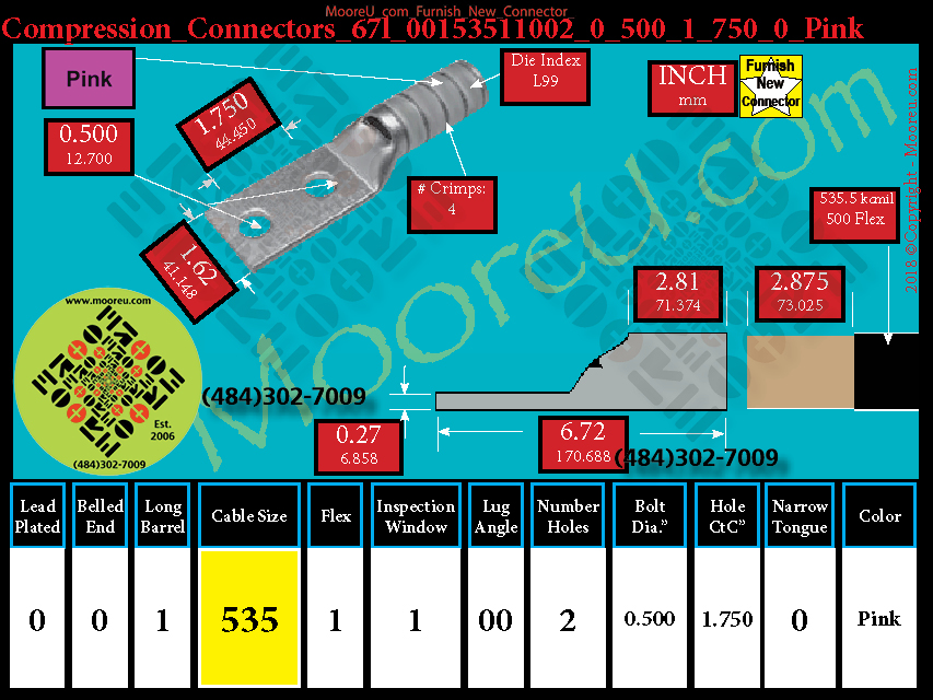 Each, Color: Pink, Lead Plate: No, Belled: No, Barrel: Long, Conductor: 535.3 kcmil 1325/24 500 kcmil Flex, Flex: Yes, Inspect Window: Yes, Angle: OO, Num Holes: 2, Bolt Size Dia: 1/2", C To C: 1-3/4", Tongue: Std, Tongue Wide: 1.62, Barrel L: 2.81, Thick: 0.27, Length: 6.72, mm x mm= 300