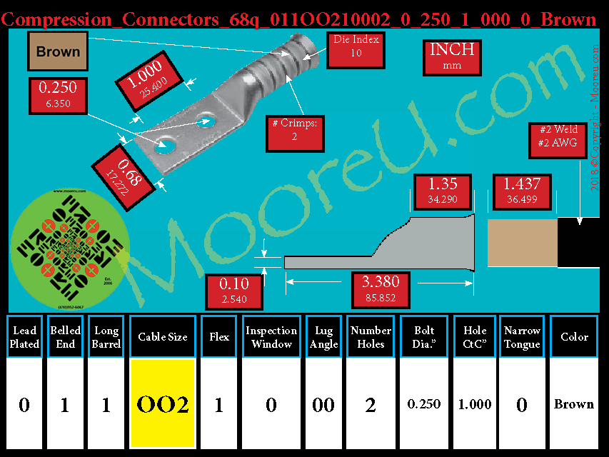 Each, Color: Brown, Lead Plate: No, Belled: Yes, Barrel: Long, Conductor: 125/24 - 150/24 #2 Weld #2 AWG, Flex: Yes, Inspect Window: No, Angle: OO, Num Holes: 2, Bolt Size Dia: 1/4", C To C: 1", Tongue: Std, Tongue Wide: 0.68, Barrel L: 1.35, Thick: 0.10, Length: 3.38, mm x mm= 35
