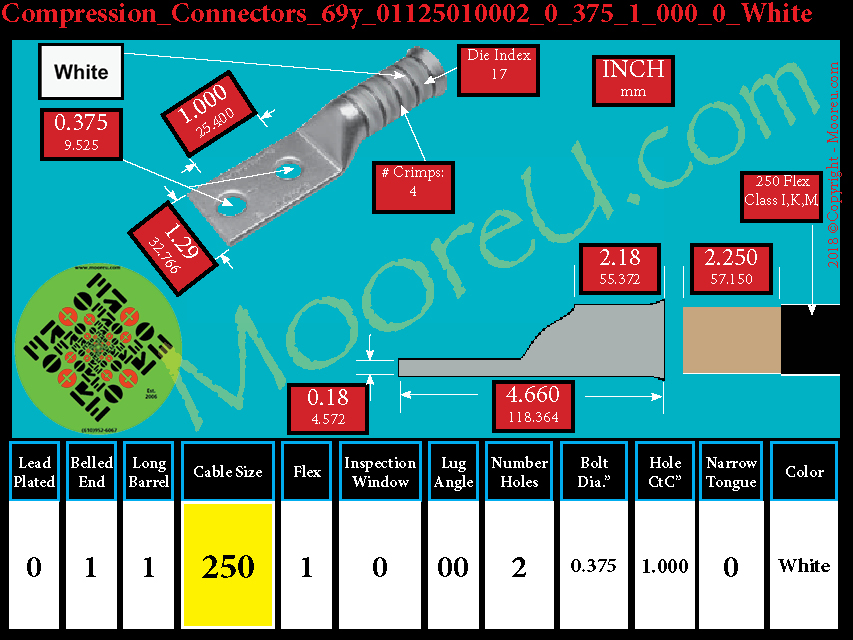 Each, Color: White, Lead Plate: No, Belled: Yes, Barrel: Long, Conductor: 250 Flex 637/24 CLASS I,K,M, Flex: Yes, Inspect Window: No, Angle: OO, Num Holes: 2, Bolt Size Dia: 3/8", C To C: 1", Tongue: Std, Tongue Wide: 1.29, Barrel L: 2.18, Thick: 0.18, Length: 4.66, mm x mm= n/a