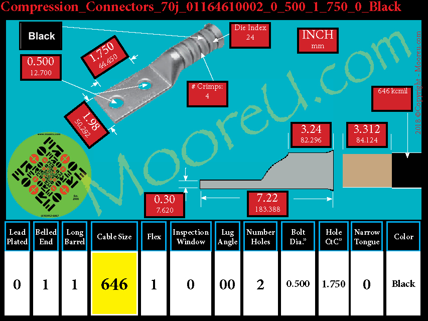 Each, Color: Black, Lead Plate: No, Belled: Yes, Barrel: Long, Conductor: 1600/24 646 kcmil, Flex: Yes, Inspect Window: No, Angle: OO, Num Holes: 2, Bolt Size Dia: 1/2", C To C: 1-3/4", Tongue: Std, Tongue Wide: 1.98, Barrel L: 3.24, Thick: 0.30, Length: 7.22, mm x mm= 400