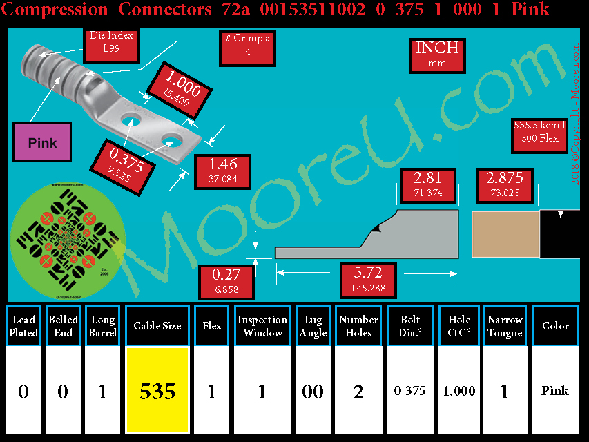 Each, Color: Pink, Lead Plate: No, Belled: No, Barrel: Long, Conductor: 535.3 kcmil 1325/24 500 kcmil Flex, Flex: Yes, Inspect Window: Yes, Angle: OO, Num Holes: 2, Bolt Size Dia: 3/8", C To C: 1.00", Tongue: Narrow, Tongue Wide: 1.46, Barrel L: 2.81, Thick: 0.27, Length: 5.72, mm x mm= 300