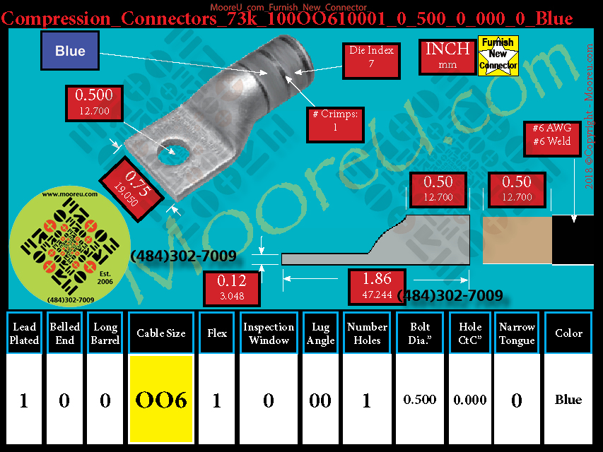 Each, Color: Blue, Lead Plate: Yes, Belled: No, Barrel: Std., Conductor: 61/24 #6 Weld #6 AWG, Flex: Yes, Inspect Window: No, Angle: OO, Num Holes: 1, Bolt Size Dia: 1/2", C To C: 0, Tongue: Std, Tongue Wide: 0.75, Barrel L: 0.50, Thick: 0.12, Length: 1.86, mm x mm= 16
