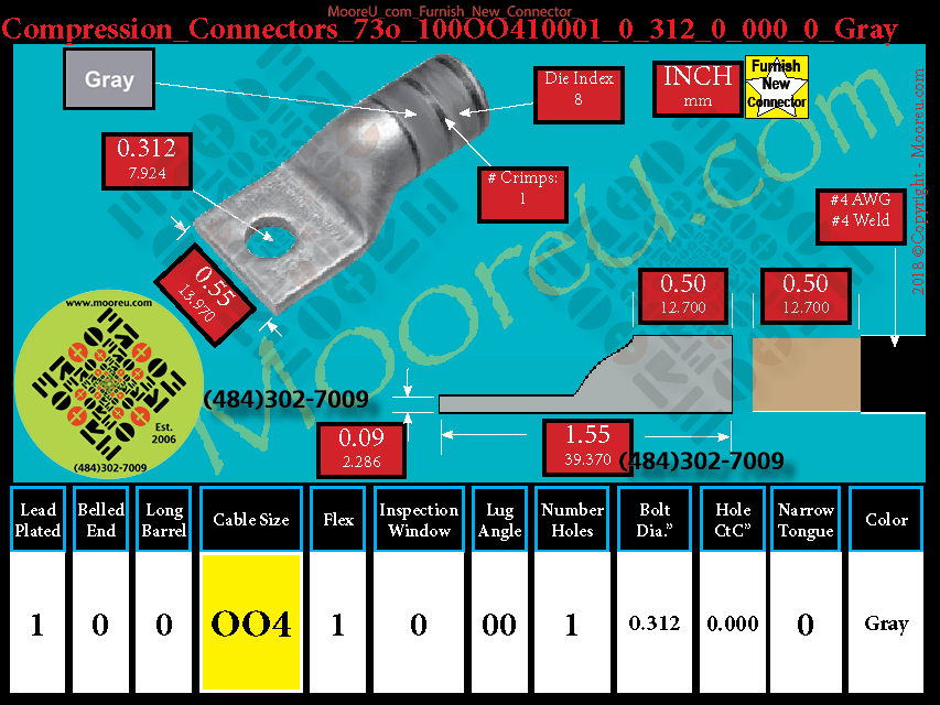 Each, Color: Gray, Lead Plate: Yes, Belled: No, Barrel: Std., Conductor: 91/24- 105/24 #4 Weld #4 AWG, Flex: Yes, Inspect Window: No, Angle: OO, Num Holes: 1, Bolt Size Dia: 5/16", C To C: 0, Tongue: Std, Tongue Wide: 0.55, Barrel L: 0.50, Thick: 0.09, Length: 1.55, mm x mm= n/a