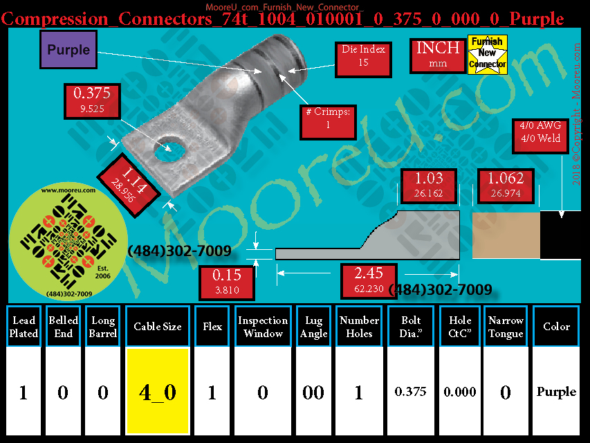 Each, Color: Purple, Lead Plate: Yes, Belled: No, Barrel: Std., Conductor: 550/24. 4/0 Weld 4/0 AWG, Flex: Yes, Inspect Window: No, Angle: OO, Num Holes: 1, Bolt Size Dia: 3/8", C To C: 0, Tongue: Std, Tongue Wide: 1.14, Barrel L: 1.03, Thick: 0.15, Length: 2.45, mm x mm= 120