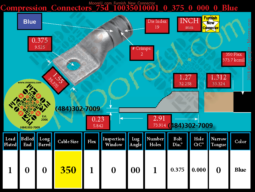 Each, Color: Blue, Lead Plate: Yes, Belled: No, Barrel: Std., Conductor: 925/24- 350 Flex 373.7 kcmil, Flex: Yes, Inspect Window: No, Angle: OO, Num Holes: 1, Bolt Size Dia: 3/8", C To C: 0, Tongue: Std, Tongue Wide: 1.55, Barrel L: 1.27, Thick: 0.23, Length: 2.91, mm x mm= 240