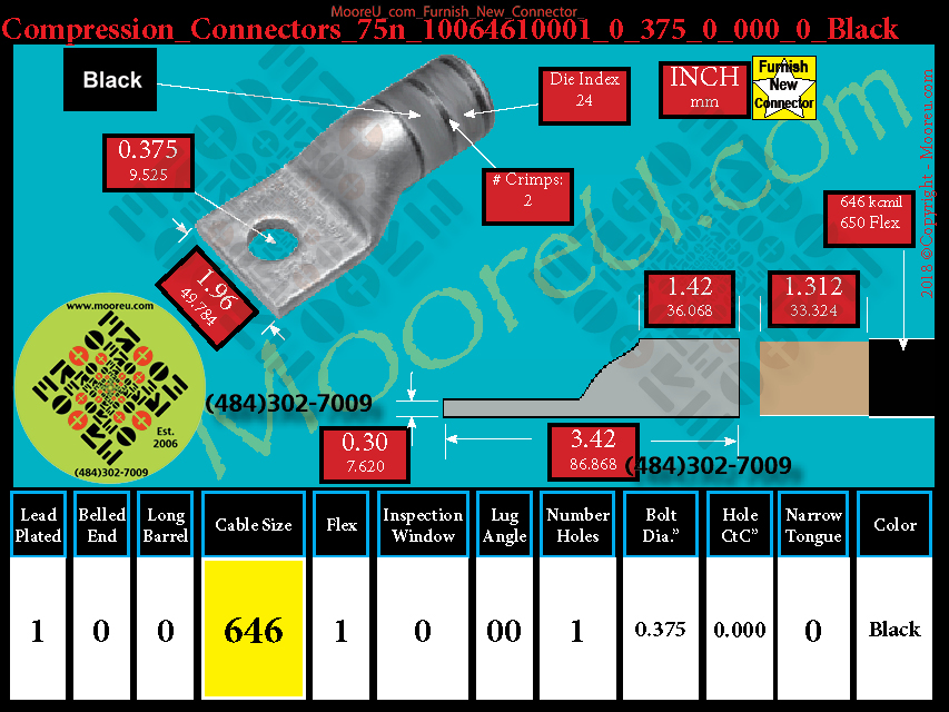 Each, Color: Black, Lead Plate: Yes, Belled: No, Barrel: Std., Conductor: 1600/24- 646 kcmil. 650 Flex, Flex: Yes, Inspect Window: No, Angle: OO, Num Holes: 1, Bolt Size Dia: 3/8", C To C: 0, Tongue: Std, Tongue Wide: 1.96, Barrel L: 1.42, Thick: 0.30, Length: 3.42, mm x mm= 400