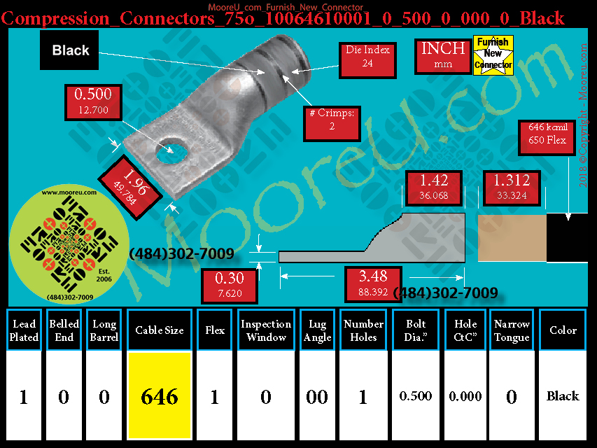 Each, Color: Black, Lead Plate: Yes, Belled: No, Barrel: Std., Conductor: 1600/24- 646 kcmil. 650 Flex, Flex: Yes, Inspect Window: No, Angle: OO, Num Holes: 1, Bolt Size Dia: 1/2", C To C: 0, Tongue: Std, Tongue Wide: 1.96, Barrel L: 1.42, Thick: 0.30, Length: 3.48, mm x mm= 400