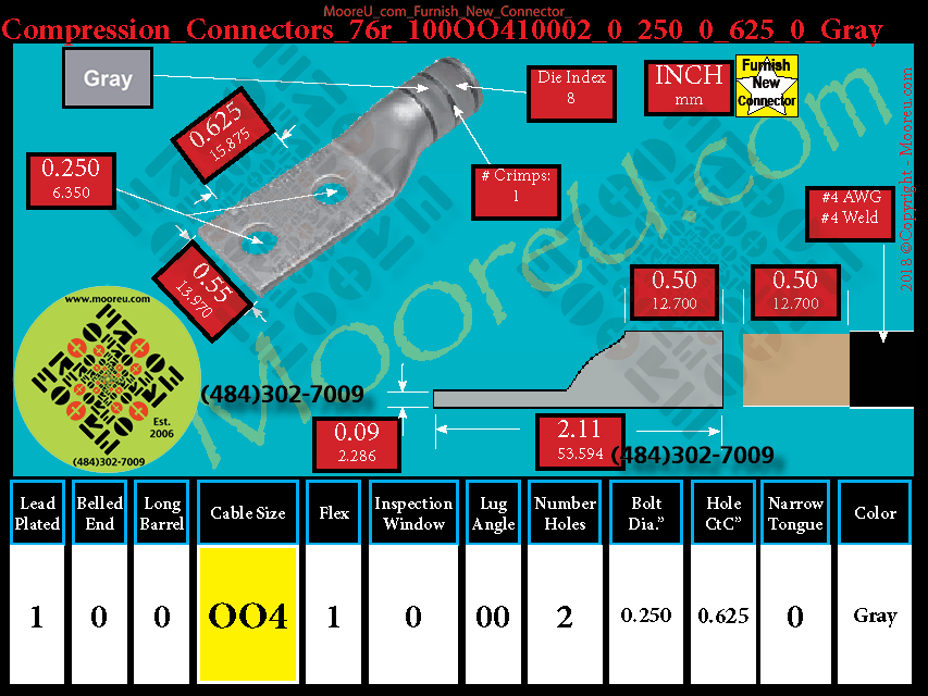 Each, Color: Gray, Lead Plate: Yes, Belled: No, Barrel: Std., Conductor: #4 Weld 91/24. 105/24 #4 AWG, Flex: Yes, Inspect Window: No, Angle: OO, Num Holes: 2, Bolt Size Dia: 1/4", C To C: 5/8", Tongue: Std, Tongue Wide: 0.55, Barrel L: 0.50, Thick: 0.09, Length: 2.11, mm x mm= n/a