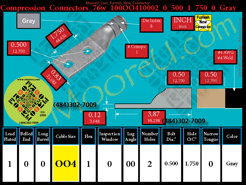 Each, Color: Gray, Lead Plate: Yes, Belled: No, Barrel: Std., Conductor: #4 Weld 91/24. 105/24 #4 AWG, Flex: Yes, Inspect Window: No, Angle: OO, Num Holes: 2, Bolt Size Dia: 1/2", C To C: 1-3/4", Tongue: Std, Tongue Wide: 0.83, Barrel L: 0.50, Thick: 0.12, Length: 3.87, mm x mm= n/a