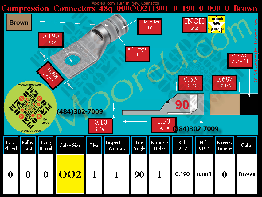 Each, Color: Brown, Lead Plate: Yes, Belled: No, Barrel: Std., Conductor: #2 Weld 125/24 150/24 #2 AWG, Flex: Yes, Inspect Window: No, Angle: OO, Num Holes: 2, Bolt Size Dia: 1/4", C To C: 1", Tongue: Std, Tongue Wide: 0.68, Barrel L: 0.63, Thick: 0.10, Length: 2.63, mm x mm= 35