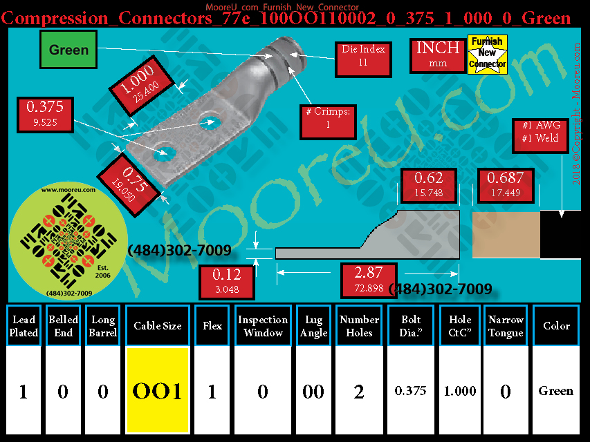 Each, Color: Green, Lead Plate: Yes, Belled: No, Barrel: Std., Conductor: #1 Weld 175/24 225/24 #1 AWG, Flex: Yes, Inspect Window: No, Angle: OO, Num Holes: 2, Bolt Size Dia: 3/8", C To C: 1", Tongue: Std, Tongue Wide: 0.75, Barrel L: 0.62, Thick: 0.12, Length: 2.87, mm x mm= n/a