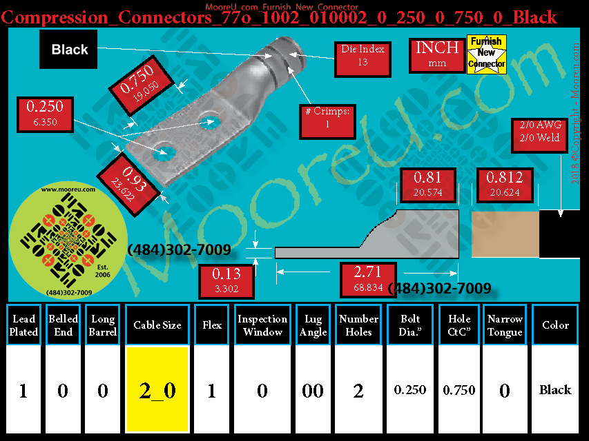 Each, Color: Black, Lead Plate: Yes, Belled: No, Barrel: Std., Conductor: 2/0 Weld 325/24 2/0 AWG, Flex: Yes, Inspect Window: No, Angle: OO, Num Holes: 2, Bolt Size Dia: 1/4", C To C: 3/4", Tongue: Std, Tongue Wide: 0.93, Barrel L: 0.81, Thick: 0.13, Length: 2.71, mm x mm= 70