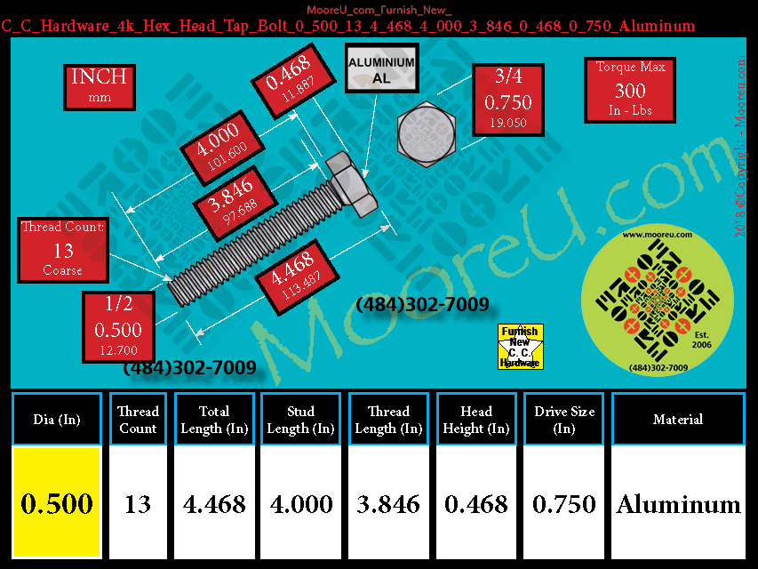 Copper Conn Hardware, Each, Component = Hex_Head_Tap_Bolt, Material = Aluminum, Dia = 1/2", Thread Count = 13, Total Length = 4.468, Stud Length = 4", Thread Length = 3.84615384615385, Torque = 300 Inch Lbs, Thread Length = 3-7/8", Height = 15/32", Width = 3/4"