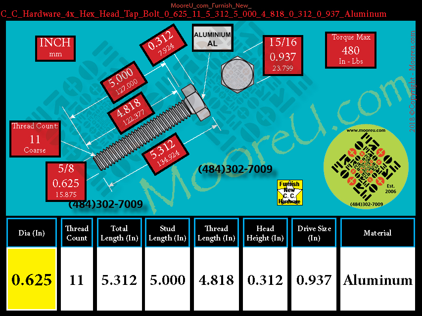 Copper Conn Hardware, Each, Component = Hex_Head_Tap_Bolt, Material = Aluminum, Dia = 5/8", Thread Count = 11, Total Length = 5.312, Stud Length = 5", Thread Length = 4.81818181818182, Torque = 480 Inch Lbs, Thread Length = 4-7/8", Height = 5/16", Width = 15/16"