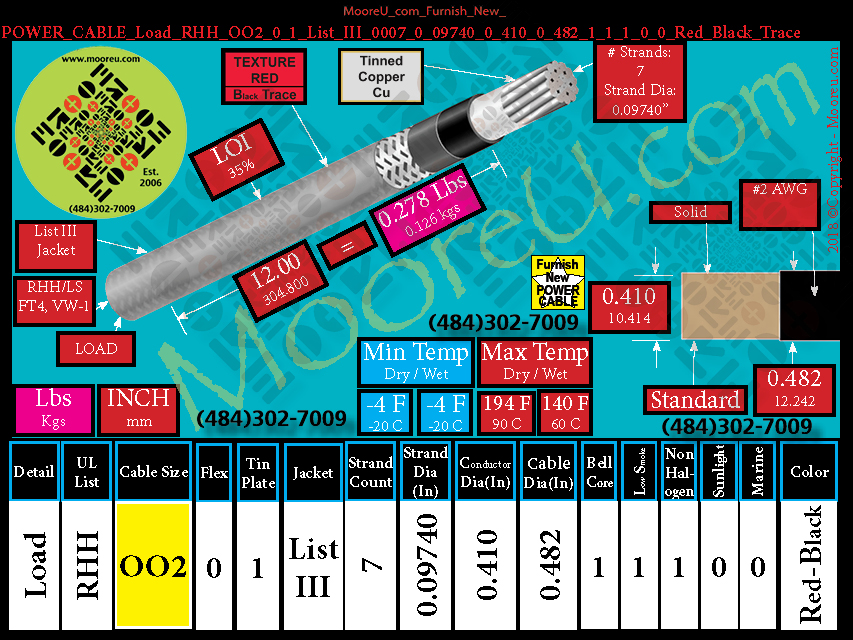 Feet,Load #2 AWG, Flex = NO, Color: Red_Black_Trace, Power Cable, Type: List III - Class B Tinned Stranded with Textile Braided Jacket, Strand: 7x0.0974in, Conductor Dia Inch: 0.41, Outside Dia Inch: 0.482, Lbs/Ft: 0.278, DryTemp C Min:-20, Max: 90, WetTemp C Min:-20, Max: 60, UL: RHH/LS FT4 and VW-1