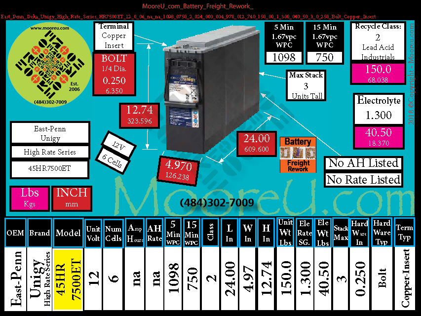 Each Unit , East Penn, Deka Unigy High Rate Series, HR7500ET, VPU=12,CPU=6, AH=na na, WPC 5min 1.67=1098, WPC 15min 1.67=750, Class =Lead Acid Industrials, Len. =24in, Wid. =4.97in, Hht. =12.74in, Wht. =150 lbs, Rating =1 300, E. Weight =40.5 lbs, Stack =3,Term. Hard. =0.25in, Hard. Type =Bolt, Term. Type=Copper Insert