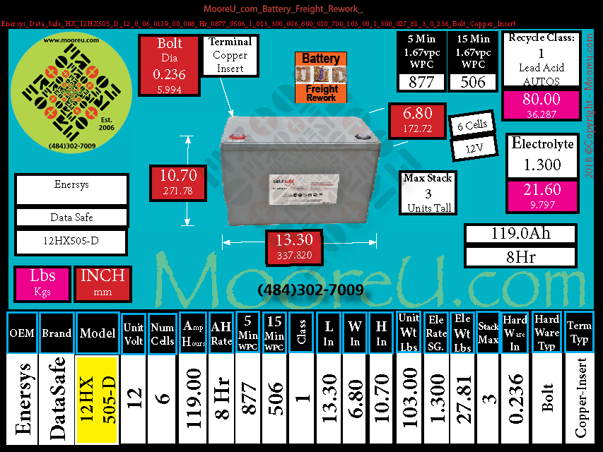 Each Unit , Enersys, Data Safe HX, 12HX505 D, VPU=12,CPU=6, AH=119 008 Hr, WPC 5min 1.67=877, WPC 15min 1.67=506, Class =Lead Acid Auto, Len. =13.3in, Wid. =6.8in, Hht. =10.7in, Wht. =103 lbs, Rating =1 300, E. Weight =27.81 lbs, Stack =3,Term. Hard. =M6, Hard. Type =Bolt, Term. Type=Copper Insert