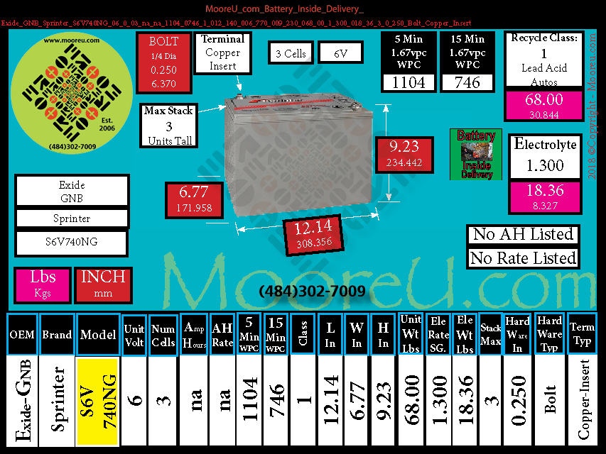 Each Unit , Exide GNB, Sprinter, S6V740NG, VPU=6,CPU=3, AH=na na, WPC 5min 1.67=1104, WPC 15min 1.67=746, Class =Lead Acid Auto, Len. =12.14in, Wid. =6.77in, Hht. =9.23in, Wht. =68 lbs, Rating =1 300, E. Weight =18.36 lbs, Stack =3,Term. Hard. =0.25in, Hard. Type =Bolt, Term. Type=Copper Insert