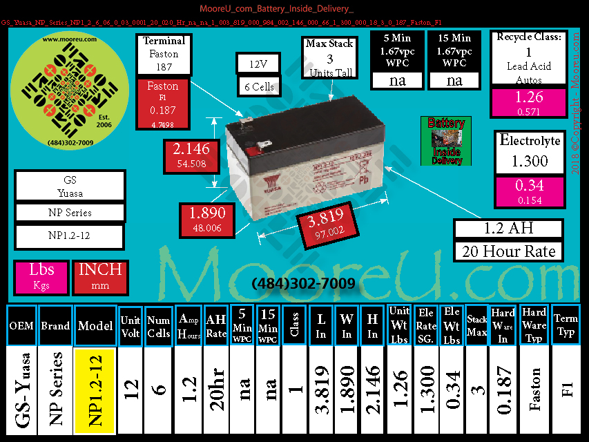 Each Unit , GS Yuasa, NP Series, NP1.2 6, VPU=6,CPU=3, AH=1.2 020 Hr, WPC 5min 1.67=na, WPC 15min 1.67=na, Class =Lead Acid Auto, Len. =3.82in, Wid. =0.99in, Hht. =2.15in, Wht. =0.662 lbs, Rating =1 300, E. Weight =0.1786 lbs, Stack =3,Term. Hard. =187 Faston Std., Hard. Type =Faston, Term. Type=F1