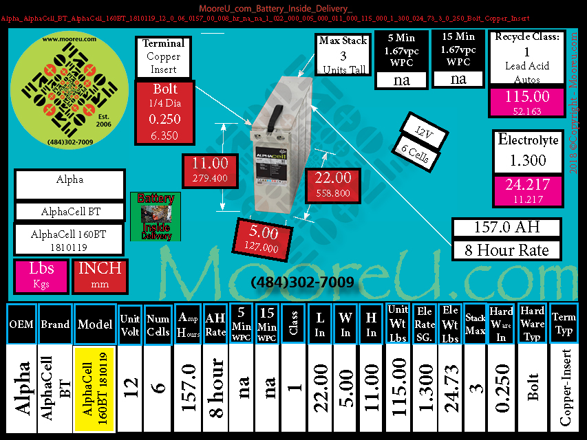 Each Unit , GS Yuasa, NP Series, NP3 6, VPU=6,CPU=3, AH=3 020 Hr, WPC 5min 1.67=na, WPC 15min 1.67=na, Class =Lead Acid Auto, Len. =5.28in, Wid. =1.34in, Hht. =2.52in, Wht. =1.434 lbs, Rating =1 300, E. Weight =0.387 lbs, Stack =3,Term. Hard. =187 Faston Std., Hard. Type =Faston, Term. Type=F1